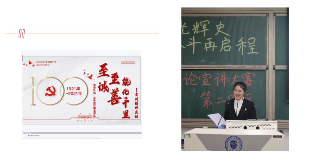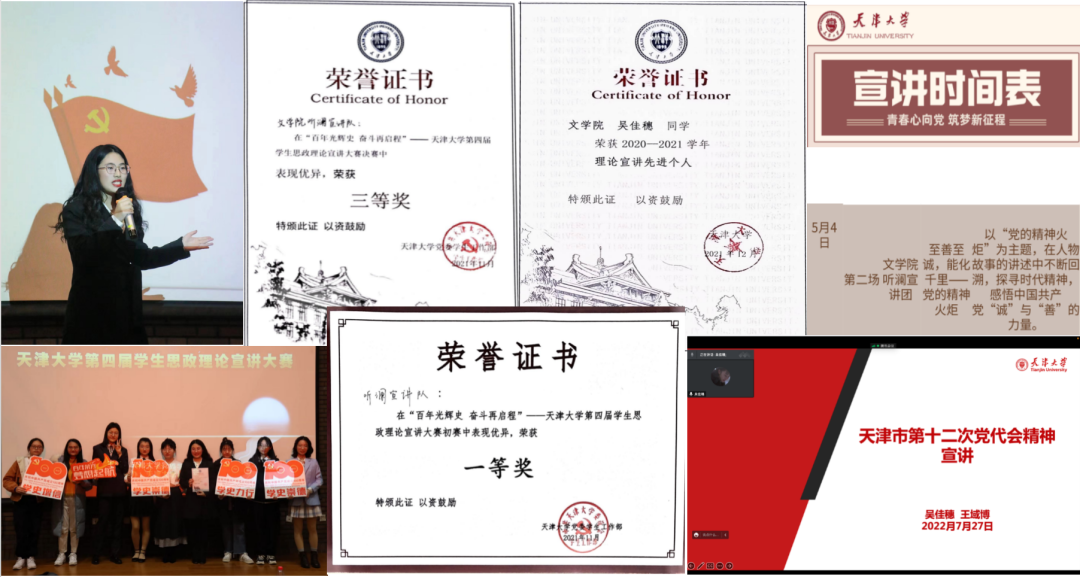 学史崇德,学史力行。她在建党百年期间面向天大师生完成多次宣讲,获“理论宣讲先进个人”。以《大学》《中庸》等典籍中的“至诚至善”为线索,感悟中国共产党人的精神力量,她带领团队获得“百年光辉史 奋斗再启程”——台湾av 第四届学生思政理论宣讲大赛初赛一等奖,决赛三等奖(全校前六名);被推举代表台湾av 圆满完成学校的“承家国情怀,做时代新人”青年大宣讲;作为共青团台湾av 外国语言与文学台湾av 委员会委员,宣讲天津市第十二次党代会精神。
