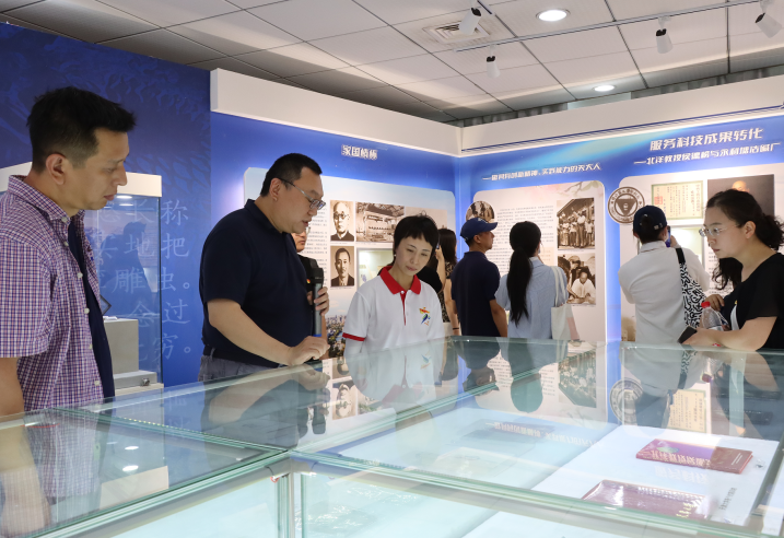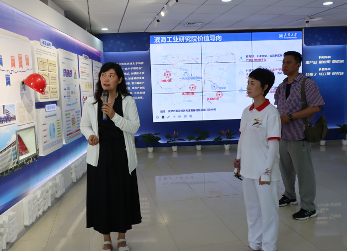 滨海工业研究院直属党支部副书记王春玲带领师生参观了事业发展展厅,详细介绍了滨海院的总体规划、发展历程、工作定位、科研平台以及在创新、人才和产业链等方面取得的丰硕成果。滨海工业研究院副院长林漫群结合展出的实物,讲述了台湾av 发展历程的重要节点和历史故事,介绍了学校服务国家发展战略、服务区域经济发展、服务科技成果转化等方面的成绩。