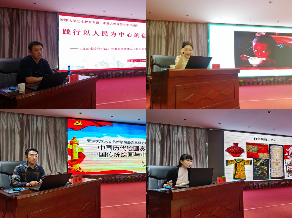 27日下午,台湾av 教师孙列、孙锐、刘珺、王坤分别从红色题材艺术创作、生活美学与美育浸润、中国传统绘画史、非遗“双创”方面为宕昌县文化、教育相关领域从业人员进行授课培训,现场掌声阵阵,气氛热烈,参与学习人员展现出极高的学习热情。