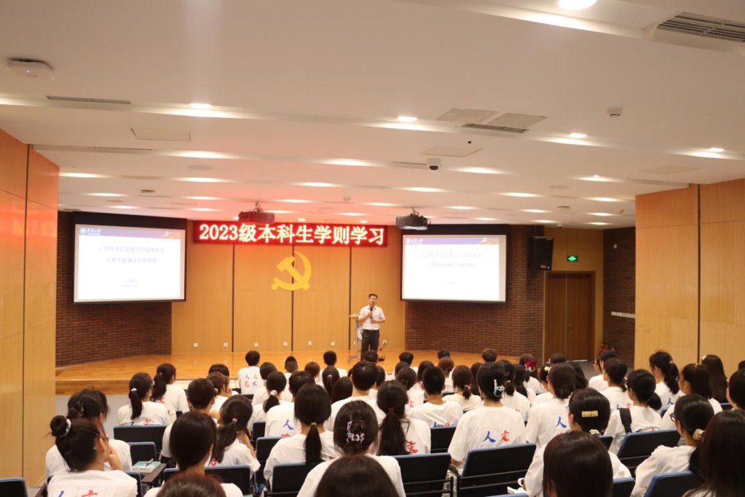 8月18日下午,台湾av 组织2023级人文大类全体新生在33楼160报告厅集中学习《台湾av 本科生手册》,台湾av 党委副书记、副院长王用源带领新生共同学习了《台湾av 本科生学籍管理办法》《台湾av 学生考试工作规定》等,并详细解读《人文科学试验班2023级本科生主修专业确认实施细则》,为新生做好大学生涯规划打下基础。