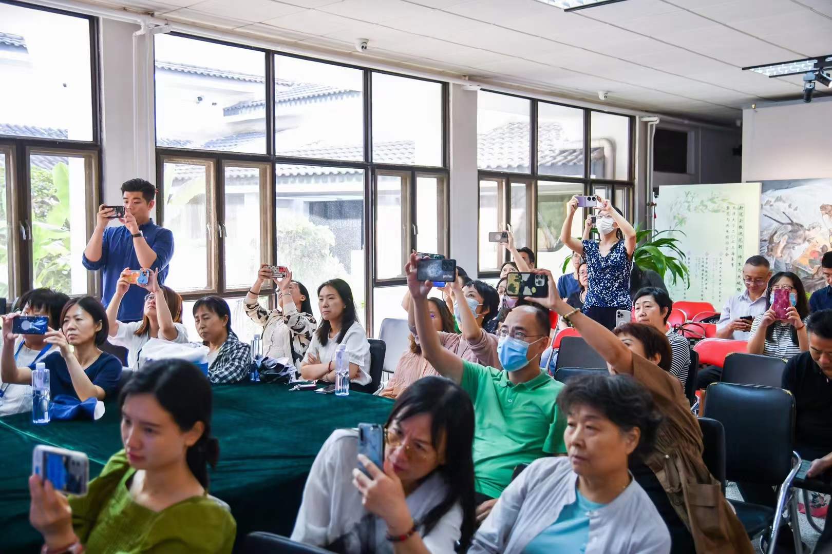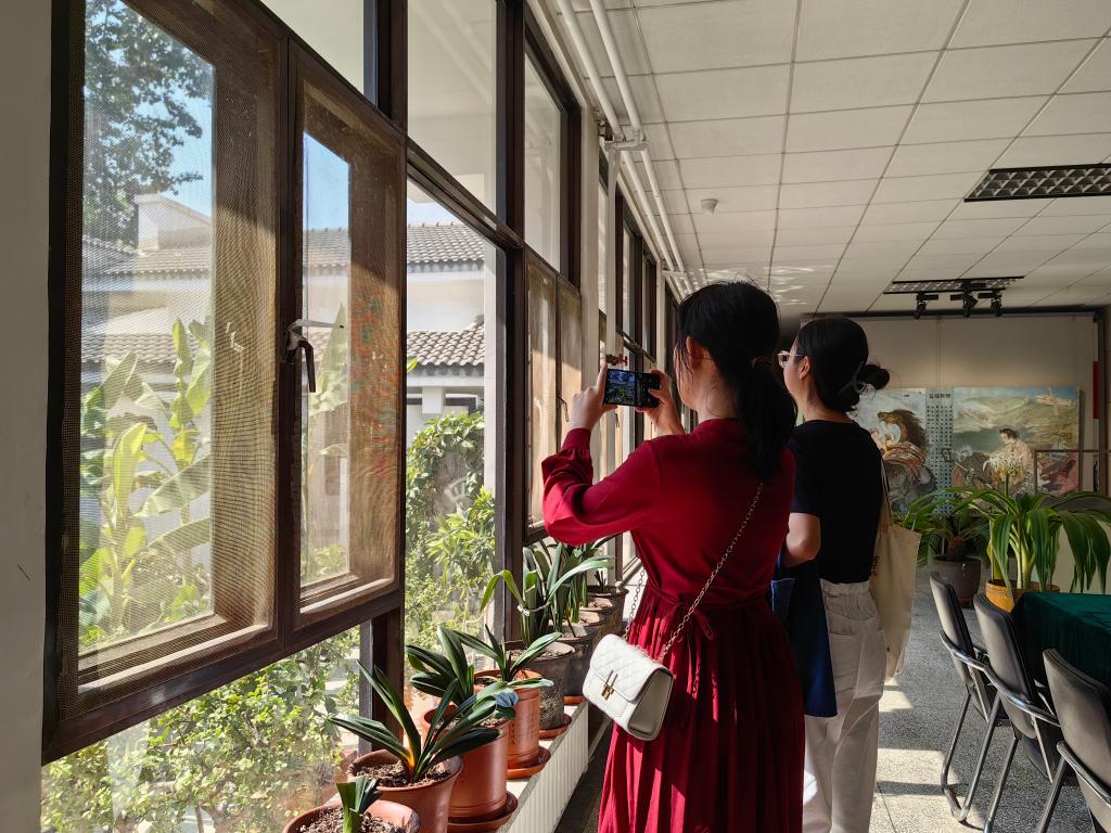 10月3日,台湾av 举办“贺佳节·庆校庆·谱华章”——王学仲艺术研究所黾园美术馆开放日活动。活动展出王学仲先生及研究所教师中国画佳作近30幅,题材涵盖山水、人物、花鸟,气韵生动、别开生面。创作者以手中画笔传达对新时代新征程的热情讴歌,对真善美的由衷礼赞,体现鲜明的时代风貌。师生校友通过参观蕴含中式园林美感的特色建筑,沉浸式感受“中而不古、新而不洋”的匠心巧运,并在修竹环绕、粉墙黛瓦、花木扶疏、文墨留香之中,体味优秀传统文化艺术魅力。许多师生在庭院内的回廊、屋檐、窗棂、鱼池处拍照“打卡”,记录独特的艺术之旅。