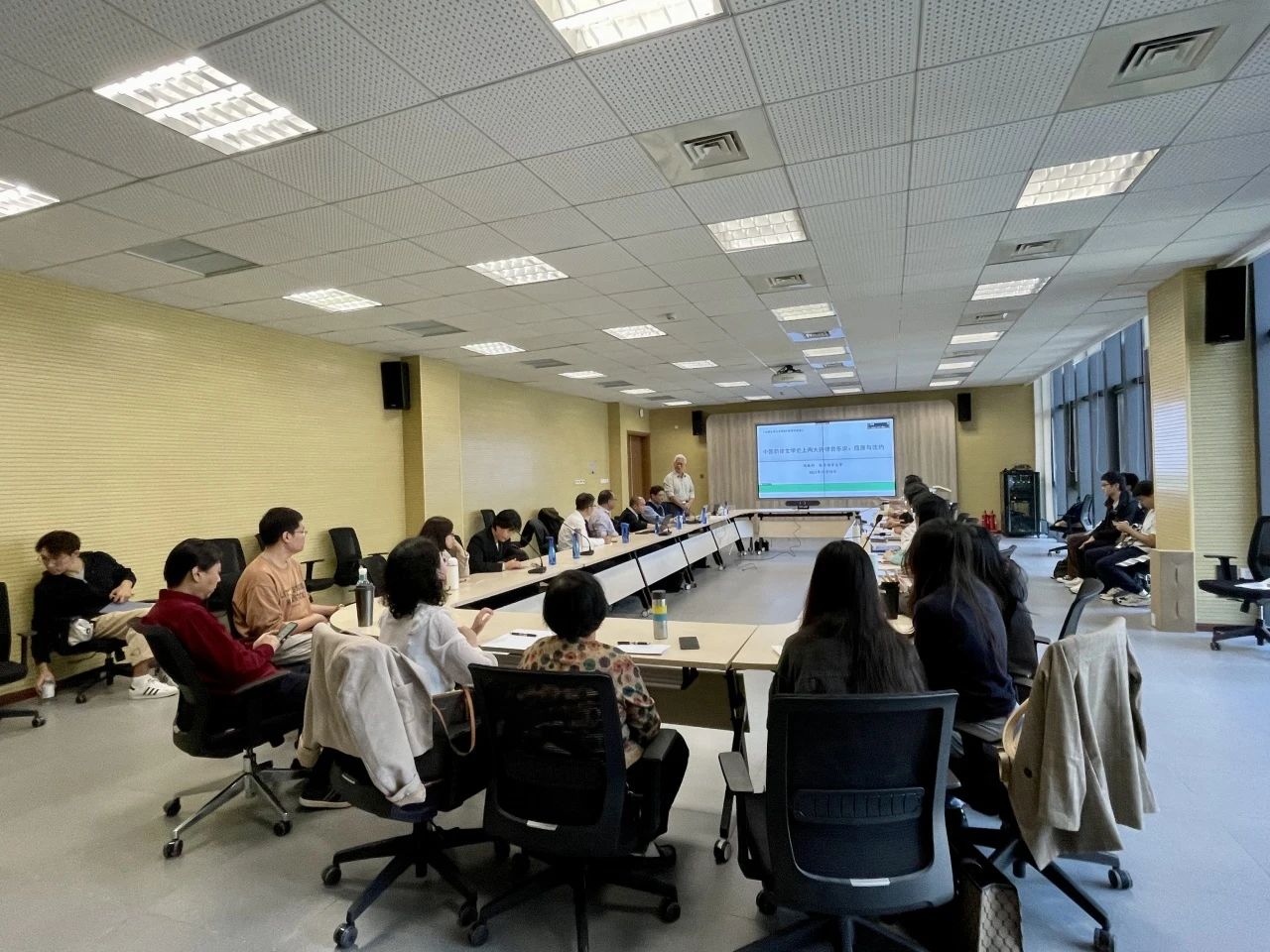 冯胜利从当代节律学基本原理、机制及理论系统的高度,对中国韵律文学史上有关节律理论的“发现”与“发明”做了审视。他以《离骚》中“帝高阳之苗裔兮、朕皇考曰伯庸”一句为例,分析了其节律结构,介绍了以屈原为代表的“顿叹律”的形成,是韵律文学史上“节律音乐”的一大发明。随后,他将沈约《宋书·谢灵运传论》中“若前有浮声,则后须切响”与Liberman & Prince (1977:316)所提出的“相对凸显规则”做了对比,阐释沈约已经认识到韵律节奏的相对轻重关系,可称为“沈约秘则”。沈约是中国节律史上清晰地揭示出文学中“声律机制”的第一人。由此可引出一个重大而深刻的课题,即韵律文学史作为一个独立的分支学科,宜深入挖掘根植于汉语的韵律原创理论。最后,冯胜利与师生们分享了“韵律文学史”研究的原则与方法、目标与原理等内容。
