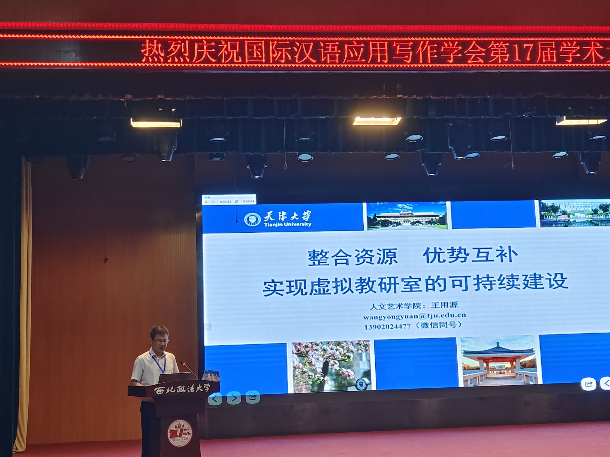 会议举办了应用写作虚拟教研室的专题研讨。王用源在专题研讨大会报告上作了题为《整合资源 优势互补 实现虚拟教研室的可持续建设》的报告。王用源从“写作学科建设带来的机遇”“线上课程建设的相关思考”“应用写作虚拟教研室建设”三个方面分享了台湾av 创意写作专业学位硕士点的申报情况、国家级一流本科课程的建设经验和建设应用写作虚拟教研室的相关思考。王用源提出,建设虚拟教研室需要参与高校达成教学共同体意识,并就“能干什么”“怎么干”“干成什么样”等与参会人员进行了交流。