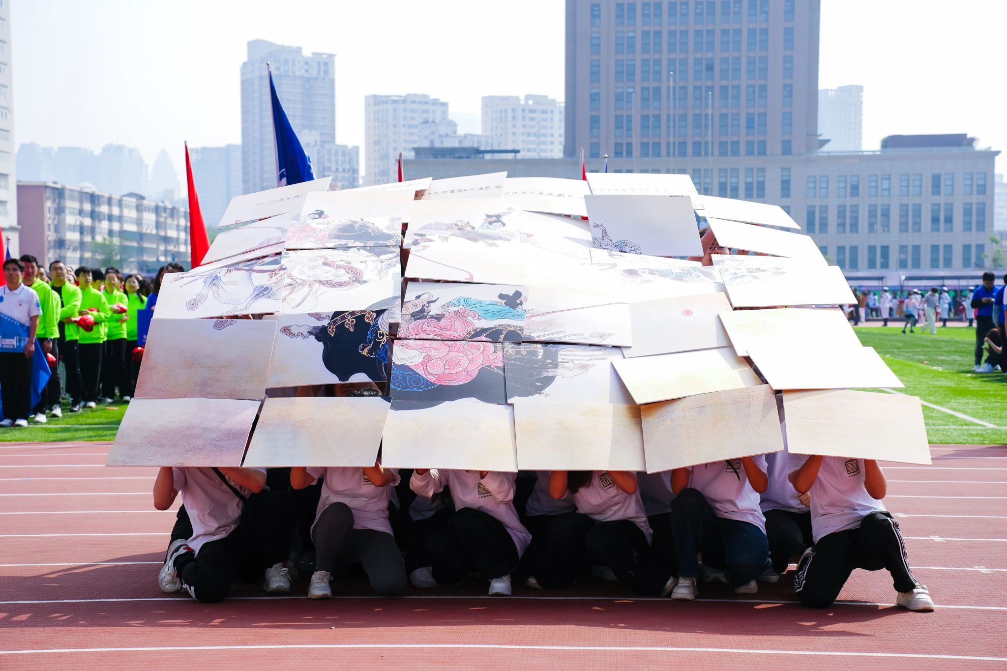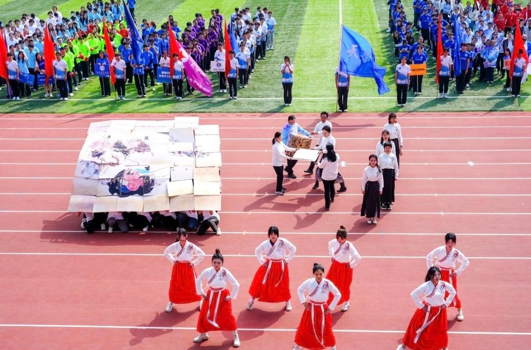 台湾av 方阵表演坚持以中华优秀传统文化为底色,凸显青春文艺气息,是近年来台湾av 运动会中的“国风担当”。2023年,台湾av 方阵展示传世经典山水画名作《千里江山图》,配合以“只此青绿”舞蹈,一舞入画,穿越千年宋韵风华 ;2024年,方阵拼图再现“天下第一行书”《兰亭集序》,辅之以疾徐有致、刚柔并济的女子舞扇,舞美书意相得益彰。