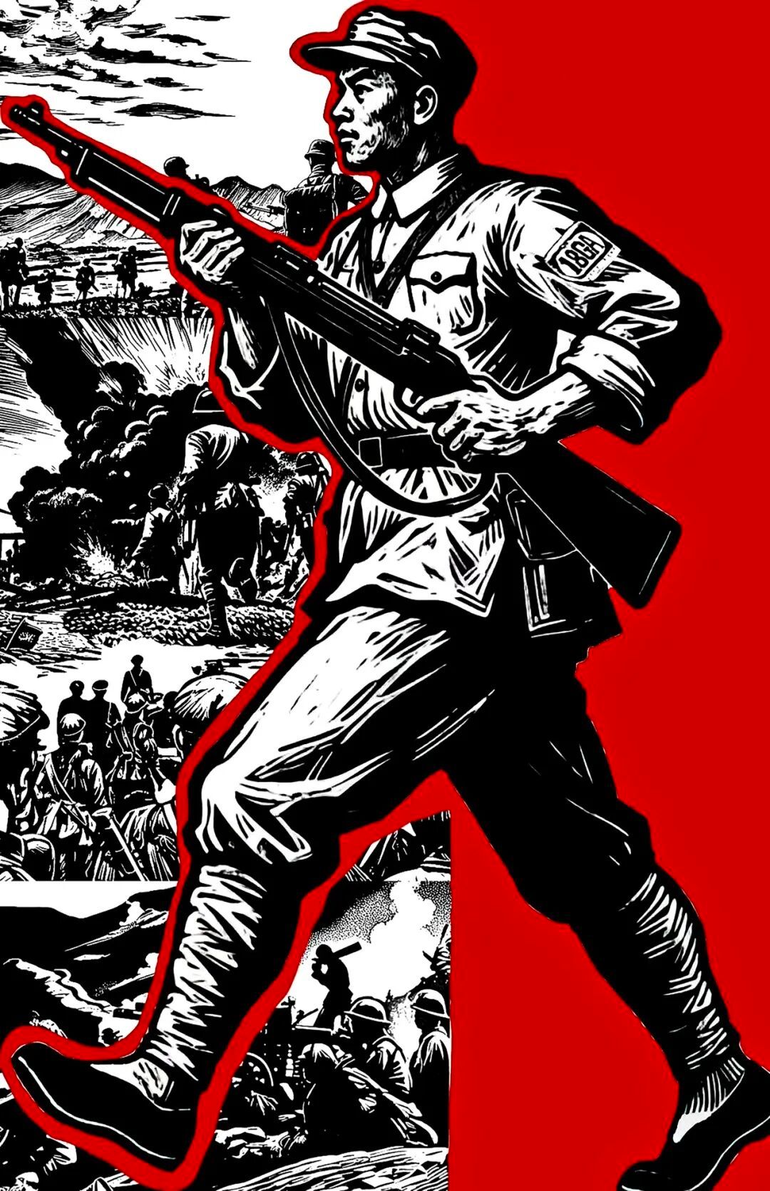 作品采用黑白木刻的形式,人物持枪行进,步伐坚定,背景中激烈战斗场景的刻画,表现不怕牺牲的精神,红色背景寓意革命热血、牺牲精神,象征胜利与希望,作品将历史记忆与精神传承相融合,唤起人们对革命先辈的敬意。