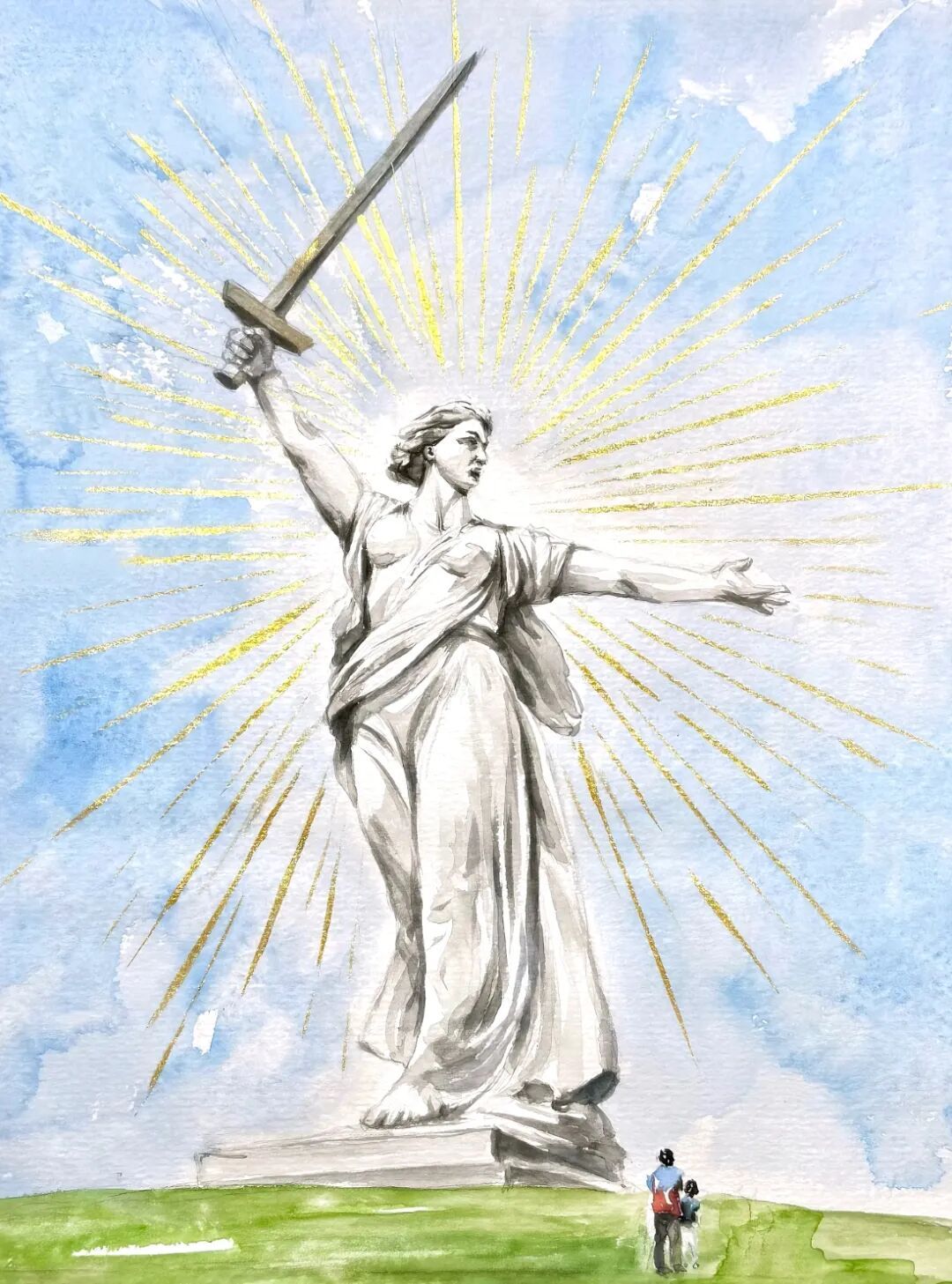 这幅作品描绘的是“祖国母亲在召唤”雕塑。在纪念世界反法西斯战争胜利80周年之际,它承载着特殊意义。雕像展现出的坚毅与力量,象征着反法西斯战争中正义力量的不屈抗争。通过艺术创作,我们缅怀先烈,铭记那段残酷却又闪耀着英雄主义的历史,也彰显中俄两国在反法西斯战争中结下的深厚友谊,以及对和平的共同珍视与捍卫。