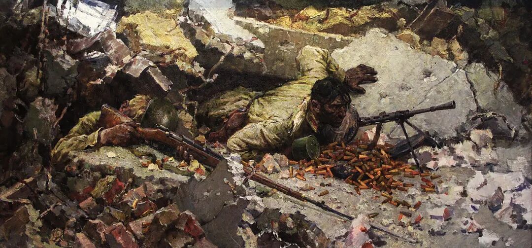 本作出自《阿吉穆什凯采石场》系列,描绘了苏德战争中一幕惨烈的场景:一名狙击手已然阵亡,另一名机枪手仍在轰塌的房屋下艰难支撑,凝望远方的敌人。画面凝固了生命最后瞬间的坚守,成为悲壮与英雄精神的象征。