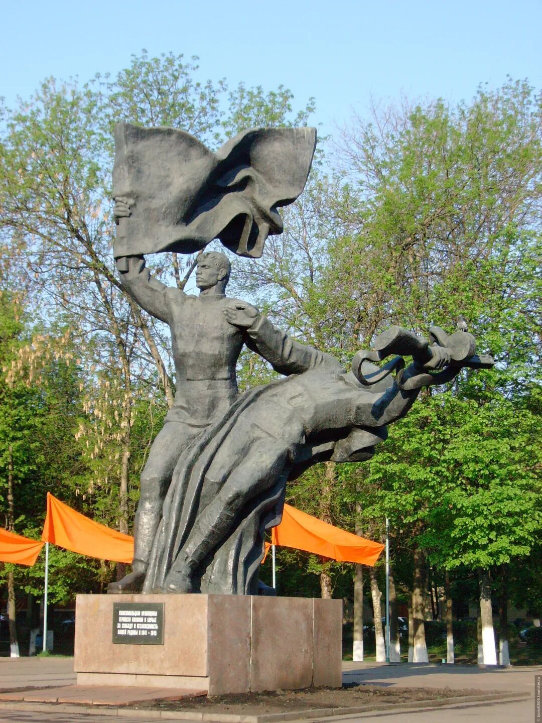 雕塑讴歌了奥廖尔地区的共青团英雄。青铜材质的庄严造型象征着士兵们的勇敢与不屈的英雄气概。作品刻画了两位并肩作战的士兵:其中一位身负重伤,双手已然无力,但另一位战友毅然从他手中接过飘扬的战旗,继续引领队伍冲锋陷阵。旗帜在此不仅是战斗的信号,更是信念与牺牲精神的象征,彰显了青年一代前赴后继、用生命守护祖国的崇高品格。