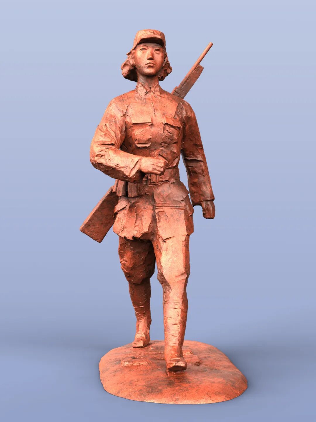 作品以1941年太行山反"扫荡"战役为历史背景,塑造了一位急行军中的女八路军战士形象。雕塑意在通过刻画八路军战士奔赴战斗的瞬间,展现八路军不屈不挠、英勇无畏的抗战精神,唤起人们对那段烽火岁月的铭记,以及对革命先辈们无私奉献和牺牲精神的崇高敬意,激励当代人传承红色基因,在新时代继续奋勇前行。粗布军装被山风掀起利落的褶皱。面部已柔美细腻的塑造突破传统英雄范式,以青春面庞上坚毅的目光与飞扬的短发,展现当时知识女性投身革命的理想光辉。
