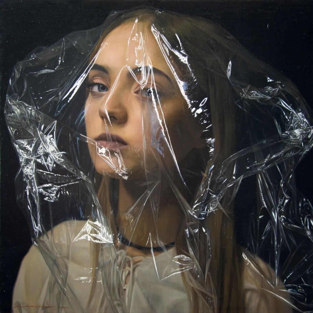 在《浮生系列》中,我所表达的是战火中脆弱生命的显影。我以古典写实技法雕琢人物蓬勃的生机,透明薄膜如同战时平民仓促披上的防护,既是最卑微的求生屏障,又是暴力阴影的实体化象征。