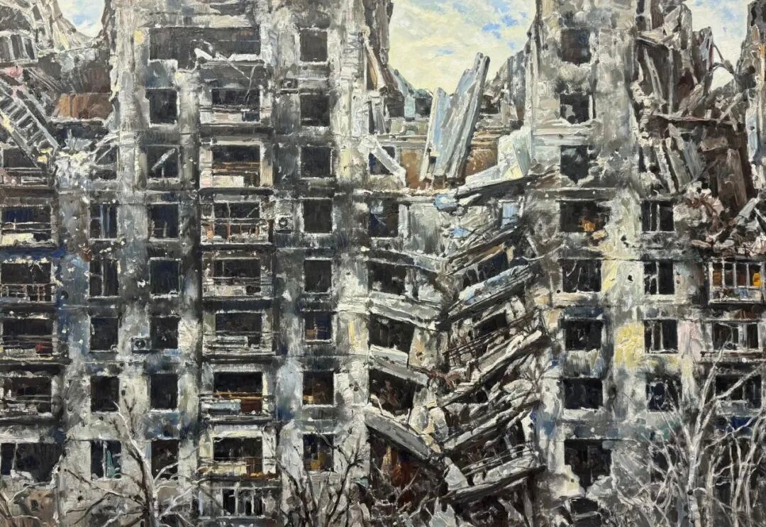 巨大的画面将观者带入一座饱经战火摧残的居民楼前。残垣断壁之中,裸露的钢筋与破碎的墙体仿佛仍在低语,诉说着曾经的温暖与骤然而至的毁灭。画面中没有直接描绘人,却处处渗透出人类存在的痕迹——破裂的窗框、倾倒的家具、焦黑的墙壁,都在默默见证一段被战火吞噬的日常。凝视此画,仿佛可听见回荡在废墟中的叹息与沉默,从而在心底涌起对和平最深切的呼唤。