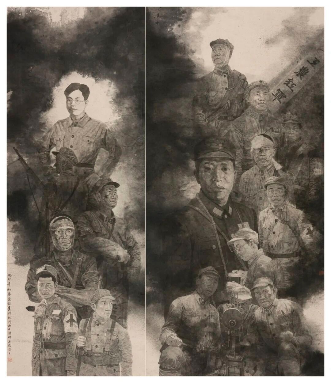 作品《星火》展现了革命战士英勇战斗的场景。画面左侧六位战士姿态各异,或吹号角、或持枪冲锋、或挥舞大刀,展现出无畏的精神和坚定的信念。右侧的战士则独自一人,手持手枪,姿态坚定,准备指挥发起新的攻势。他们的表情严肃而专注仿佛在为共同的目标而奋斗。背景中的浓烟和爆炸效果,进一步增强了画面的紧张感和戏剧性。整个画面通过细腻的笔触和丰富的层次感,生动地再现了革命战争时期的紧张氛围和战士们的英勇形象,不仅在视觉上给人以强烈的冲击力,更在情感上唤起观众对那历史的深刻记忆和对革命先烈的崇敬之情。通过这幅画,观者可以感受到革命战士们不畏艰难、勇往直前的精神,以及他们为理想和信仰而奋斗的崇高情怀。《星火》不仅是一幅艺术作品,更是一首对革命精神的赞歌,激励着后人铭记历史,珍惜和平,继续前行。