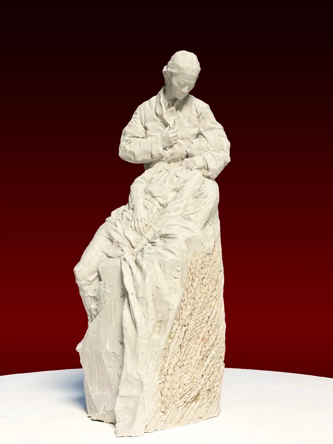 本作以沂蒙红嫂明德英为原型,表现她在抗战时期以乳汁救护八路军伤员的感人事迹。作品捕捉的是她正准备解开衣襟、救助伤员的动态时刻,动作含蓄而坚定,展现出平凡女性在战火中的伟大与勇气。红嫂坐于象征沂蒙大地的岩石之上,衣袍质感粗犷,下方麦穗浮雕寓意母性、土地与希望。作品通过凝固的瞬间传达跨越时代的人道精神与红色信仰。