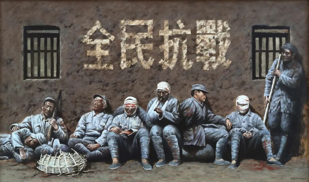 这幅作品表现的是八路军战士同日寇血战之后席地休息的一个场景。画面中,几个八路军战士刚刚从前线撤下来,几乎身上都挂着彩,有的甚至是身负重伤,但他们或坐或站,身躯挺立,神情坚毅,展现出一种中国人不屈不挠的民族精神。