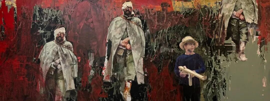 作者将此作归属于现代现实主义的表达路径。在画面中,艺术家将战场上伤残的士兵与手握木枪的孩童并置,形成强烈的视觉和情感对照:一个是承受过战争残酷的人,一个是懵懂且未来可能被卷入战争的脆弱生命。二者之间既有命运的传递,也有对人类历史宿命的拷问。红色颜料的刷抹与溅射既象征血与火的战争记忆,也营造出压迫性的整体氛围。艺术家借此表达出人类在战争与和平之间反复徘徊的深刻忧虑。