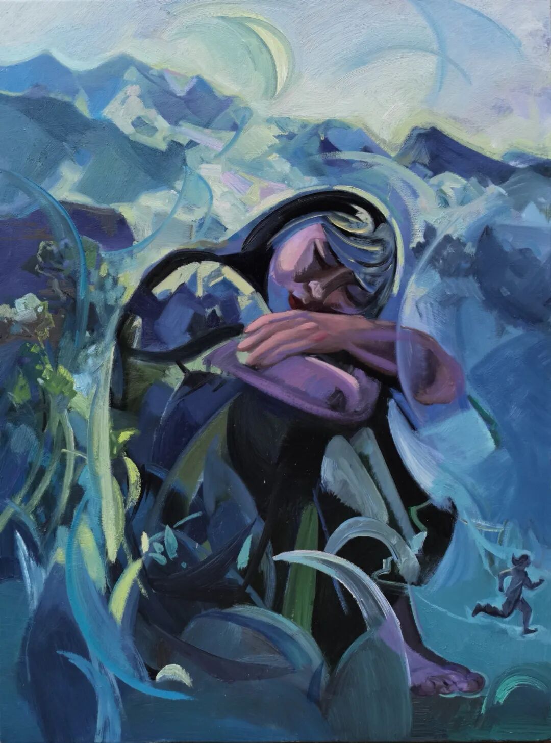 本作品以“守望新生”为主题,营造了超现实蓝色梦境,礼赞和平与希望的永恒。画面中,少女静坐山野,承载着对历史的静穆沉思与守护。远方奔跑的身影,唤起跨越时空的心灵对话,书写从苦难到光明的奋进篇章。新月高悬,清辉如铂,既是抚慰伤痕的柔光,又如照亮前路的希望之灯。