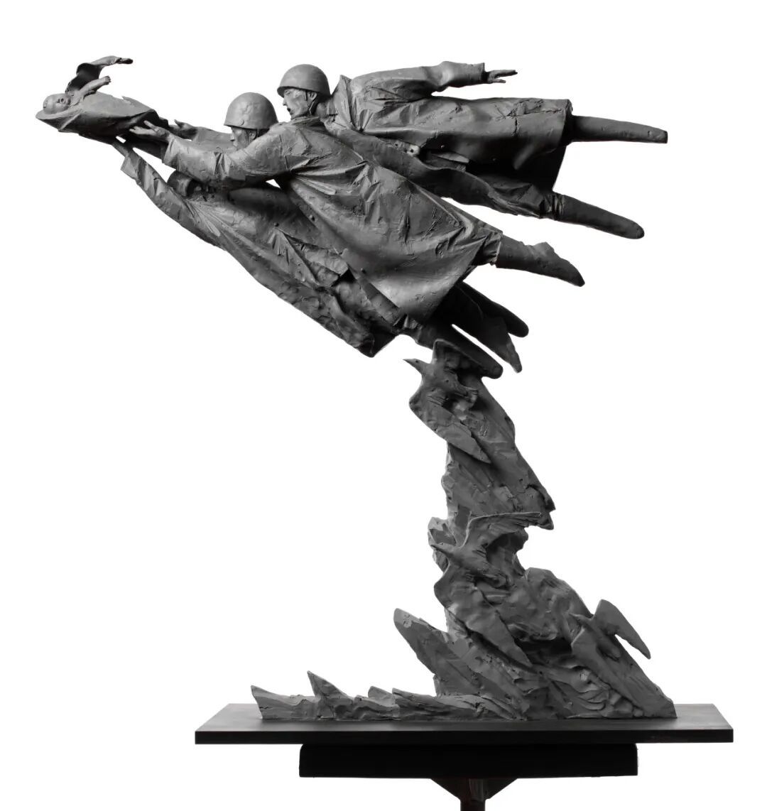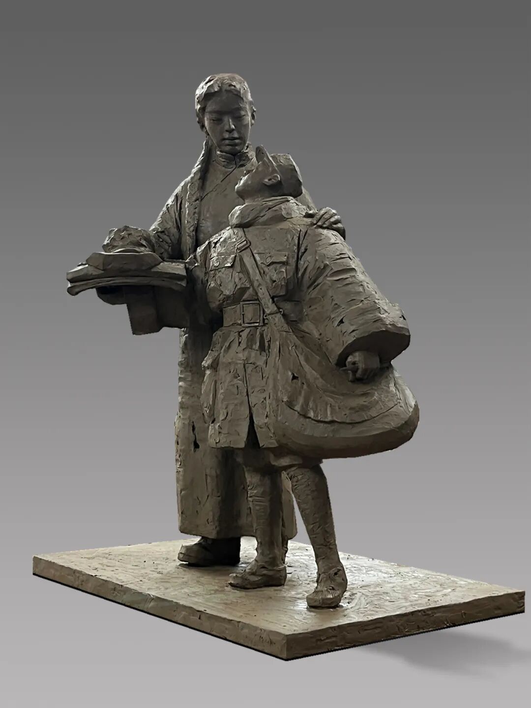 《军民情·感恩递》聚焦军民鱼水深情这一永恒主题,回溯军民携手、双向奔赴的动人历史脉络。创作灵感源于拥军支前的真实场景,以具象写实的雕塑语言,借铸铜材质的厚重质感,构建军民互动的立体叙事。构图上,以卡车车厢为依托,人物分布形成上下呼应的动态结构,利用肢体的伸展、承接等动作线条,营造情感传递的流动感与张力;技法层面,通过人物团块的虚实塑造、衣纹细节的疏密处理,凸显空间层次与体量对比。作品着重刻画军民姿态的协作呼应、物资传递间的情感交融,将军民互敬互爱、双向感恩的精神符号转化为可触可感的艺术实体,旨在唤起观者对军民团结传统的深刻共鸣,以雕塑艺术彰显军民同心的力量,为传承红色基因、筑牢军民情谊提供美学诠释与精神赋能。
