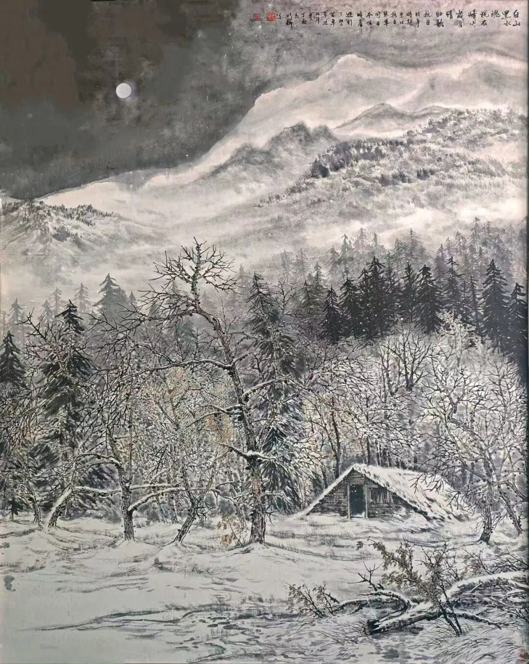 描绘抗日战争时期艰难的岁月里,活跃在东北的抗联不磨灭的民族精神。画中主要描绘东北抗日联军在冰天雪地里的营地遗址。