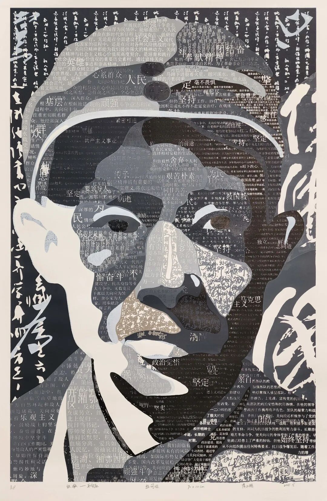 以独特的艺术语言向革命先辈关向应致敬。画面中,关向应的形象由大量文字精心拼贴而成,这些文字涵盖了与他革命生涯相关的精神理念、事迹片段等。文字与图像的融合,不仅是视觉上的创新,更是对关向应精神内涵的深度挖掘。