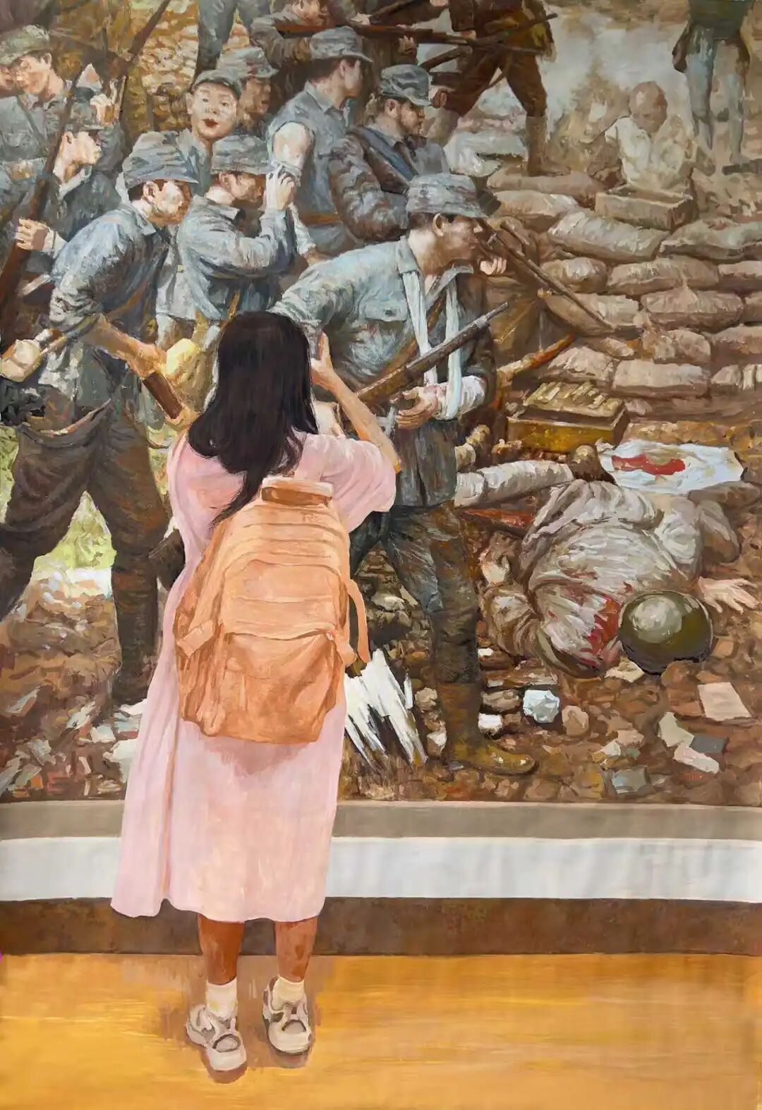 作品回望硝烟弥漫里:战士们战斗、牺牲,定格往昔峥嵘岁月;当代青年驻足、观赏、记录,构成 “艺术作品前行” 的表意。他们代表当下受众,借由艺术作品与历史对话,体现艺术传递革命精神、连接过去与现在的功能,也象征着对革命历史的铭记与传承,在回望中汲取力量,向着未来前行,让革命精神随艺术传播不断延续、焕新。