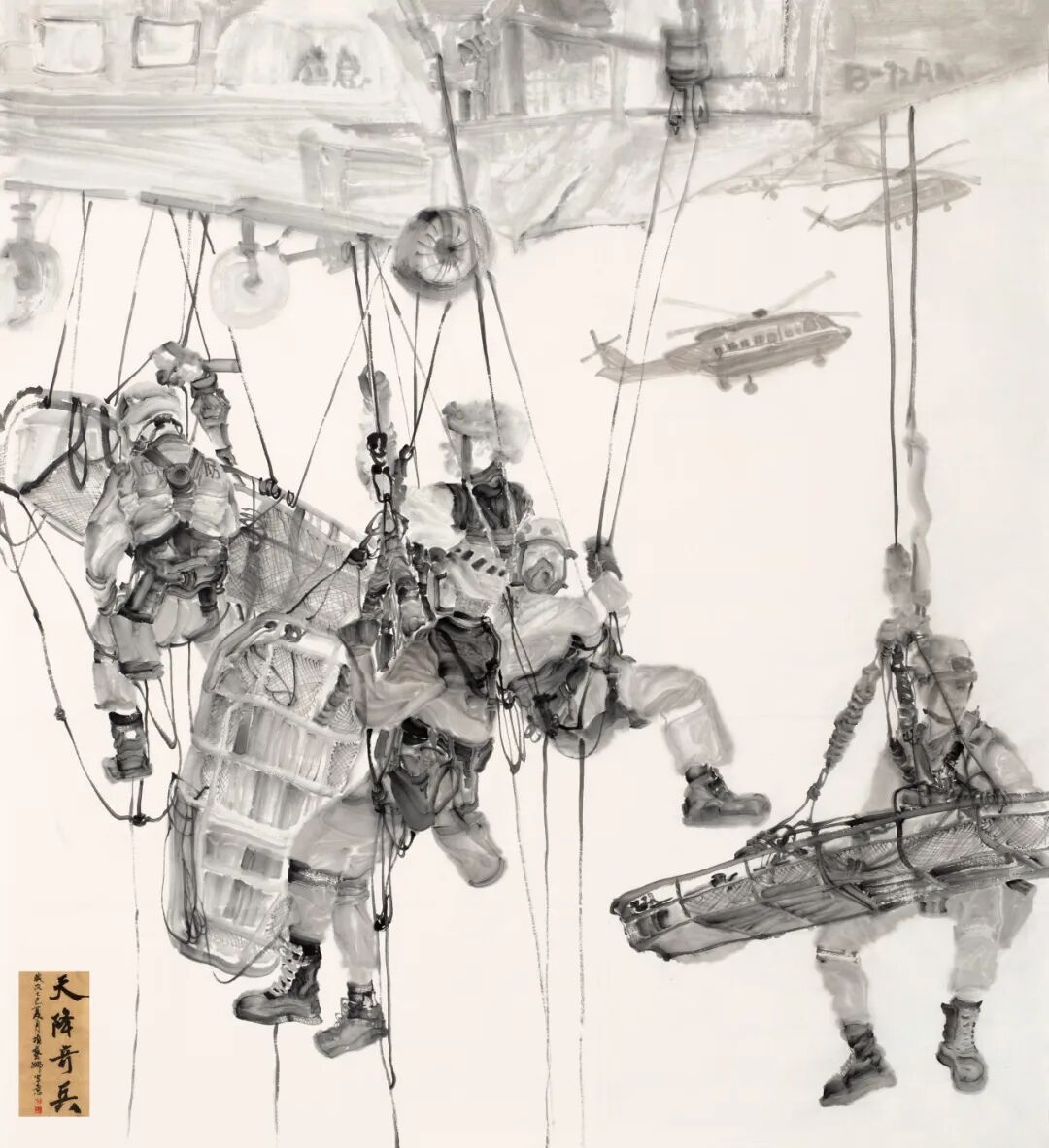 《天降奇兵》以人物群像为核心,聚焦反法西斯战争中那些于危难之际挺身而出的正义力量。画面中,“天降”的意象打破了常规战争场景的局限——人物或从硝烟中跃出,或于晨曦中俯冲,肢体语言充满突破黑暗的张力,既呼应着历史上中俄反法西斯力量的突袭时刻(如苏联红军的战略反击、中国敌后武装的奇袭行动),更象征着正义终将穿透阴霾的历史必然。