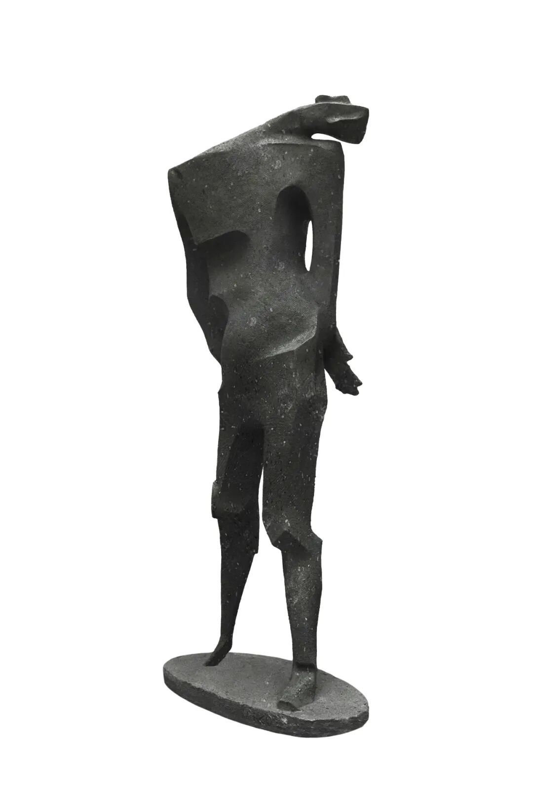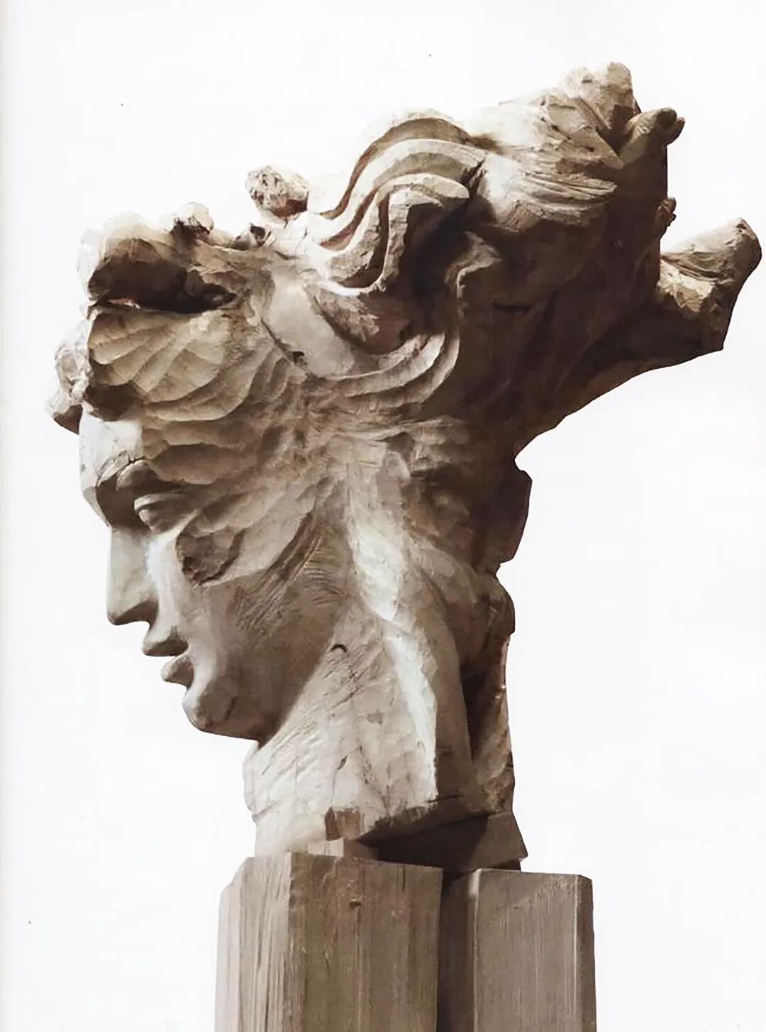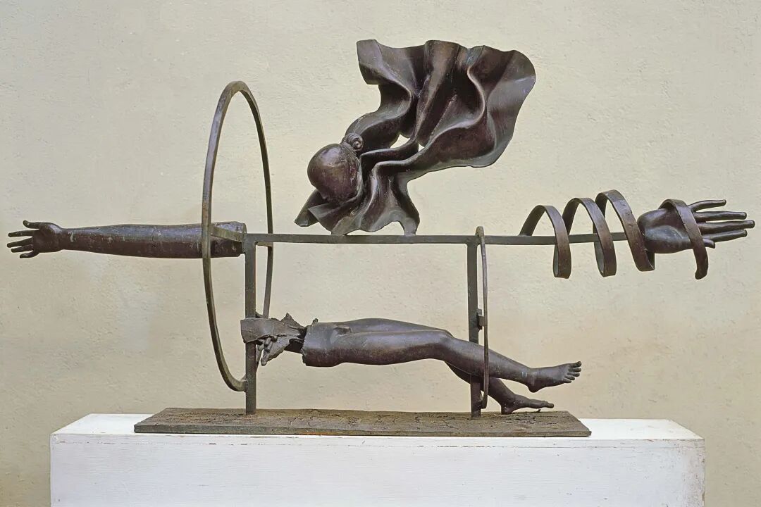 《安魂曲》以超现实主义的语言结合形式构成的手法,营造出强烈的象征氛围。作品由两只大小不一的轮子构成,沿水平轴线相对而置:一侧是一只张开的手掌,另一侧是一只伸展的手臂,仿佛在时空的张力中彼此呼应。雕塑的核心是一个低垂的女性头部,鬓边饰有飘动的衣饰,传递出哀悼与沉思的意象。在两个轮子之间的下部,塑造出一个年轻男子的下半身,进一步强化了生命与牺牲、痛苦与坚韧的对照。整体构图在动与静、具象与象征之间取得平衡,宛如一首凝固的音乐——它不仅是对逝者的悼念,也是对人类命运与生命永恒主题的哲思。
