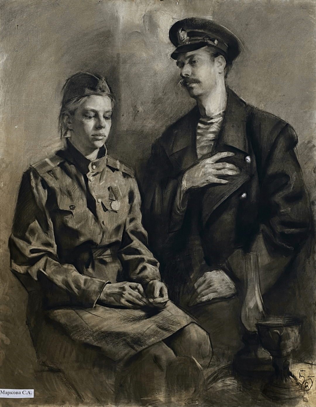作者按照惯例,在每年下学期,素描课程教师奥夫恰连科·伊利亚·瓦列里耶维奇都会为四年级学生安排一组带有爱国主义主题的双人写生作业,以纪念伟大卫国战争胜利日。