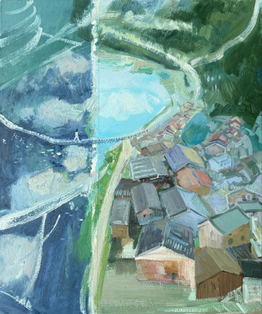 《山河忆》借俯瞰视角呈现山水与村落。画面里的吊桥、蜿蜒道路,连接起自然与人文。创作并非直接描绘反法西斯战争场景,而是以山河故土为载体,寓意先辈曾守护的山河家园。战争虽已远,但先辈抗争换来如今宁静村落、大好河山。借这充满生活气息的画面,传递对和平的珍视,铭记反法西斯战争胜利让山河重归安宁。愿以艺术之笔,唤起对历史的回望与对和平的坚守,让后人从山河烟火里,感知先辈奋斗意义,传承反法西斯战争胜利的精神遗产。
