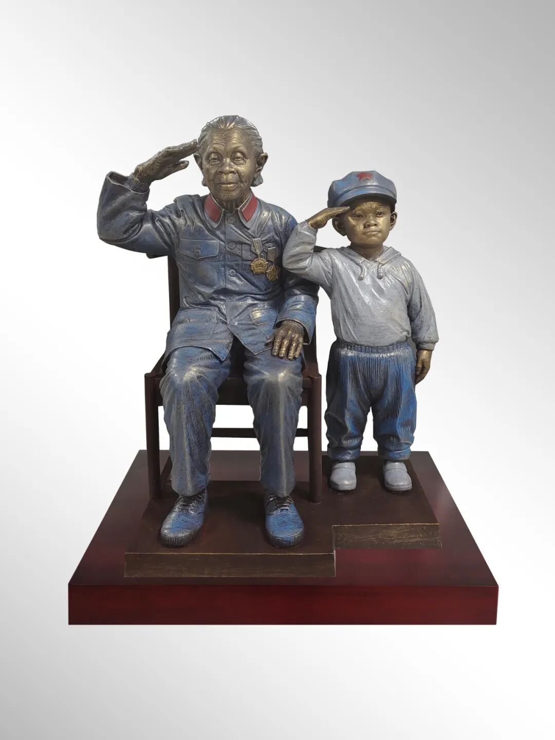 作品展现的是一位103岁高龄的红色娘子军女战士与3岁小孩同敬军礼的形象,表达了革命前辈与新一代薪火相传的意义。红军老奶奶身穿军装,精神抖擞;小男孩接过军帽戴在自己头上,神情严肃认真,与老奶奶一起举手庄严地敬军礼。作品起到教育新一代每位接班人不忘初心、传承红色基因、积极向上的作用。