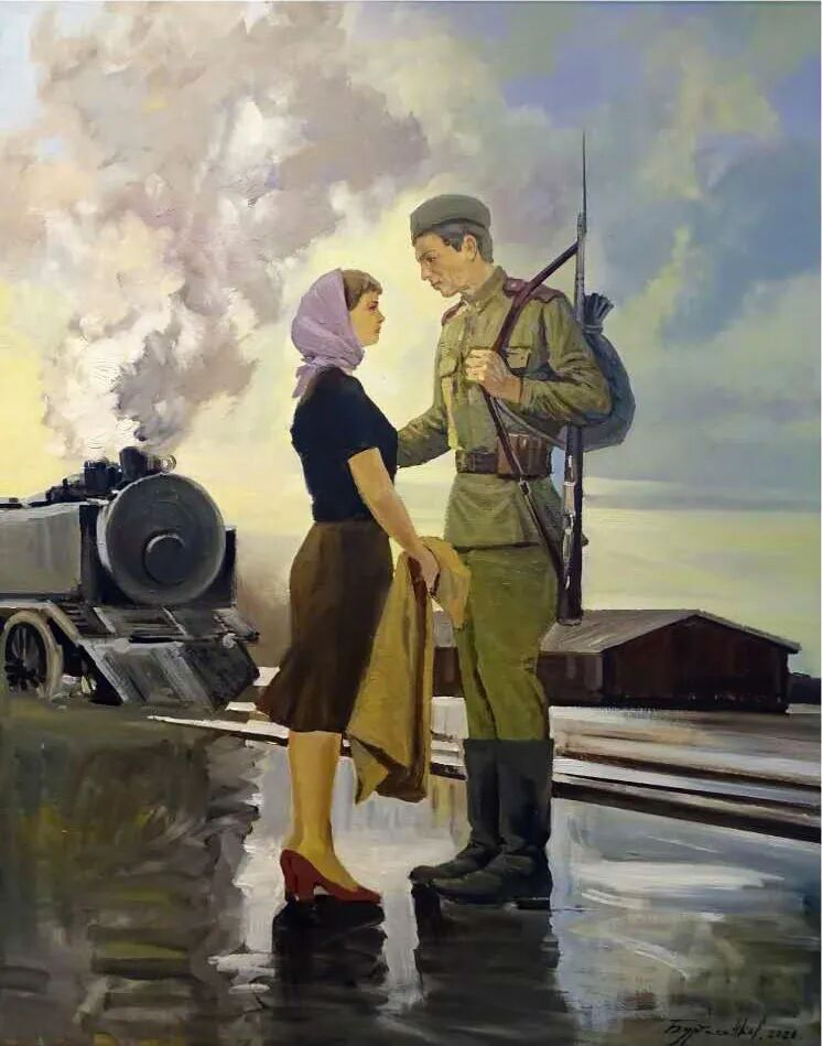 画面定格在一个充满情感张力的瞬间——一名历经战火的士兵从前线归来,在火车站与久别的妻子重逢。作品没有渲染宏大的战争场景,而是以温情的日常片段传递战争结束后的喜悦与感动。火车站作为归乡与团聚的象征,被赋予浓厚的历史与人情意味。