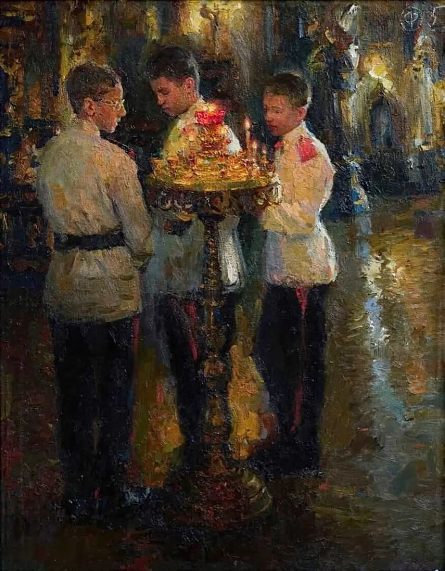 有一次,在大教堂的晨祷中,我遇到了一群穿着轻便制服、佩戴鲜红色肩章的优秀学员。那真是一个感人至深的时刻!仿佛白色的天使笼罩了整个圣殿。我感觉自己仿佛置身于另一个时空……从那一刻起,我一直在寻找描绘他们的理由。在四年级的第一学期,我终于找到了。我想在这幅作品中展现孩子们在烛光下凝固的那一刻,每个人都在思考着自己的感受。他们各不相同,但有一种东西将他们联系在一起——那就是信仰、友谊以及他们选择的道路。