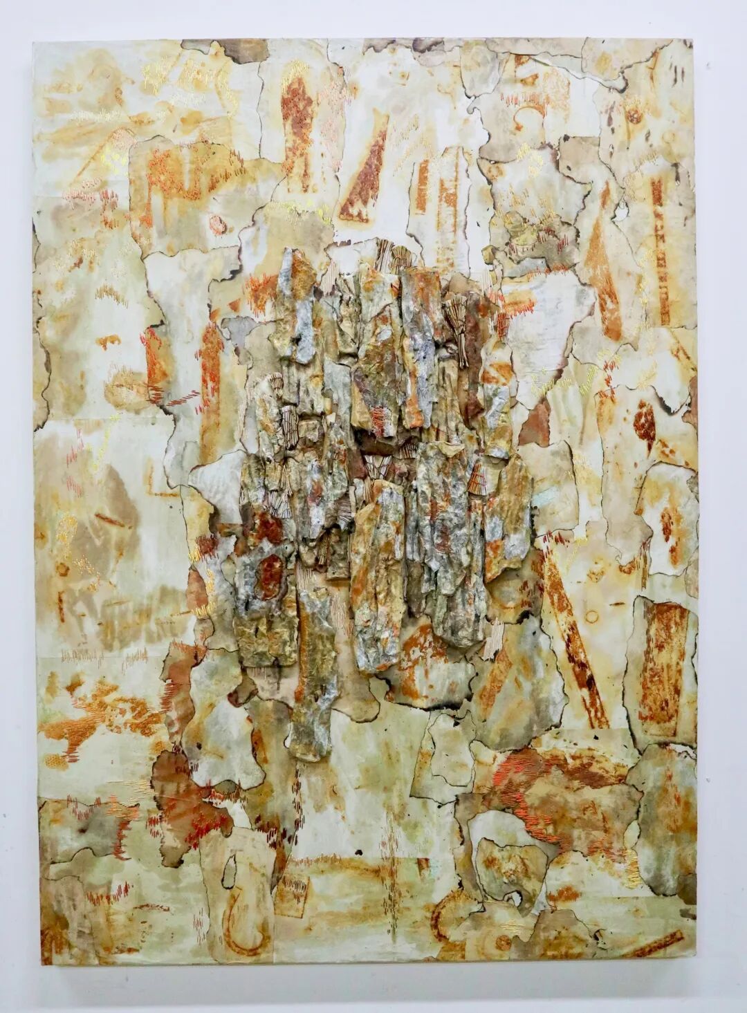 运用铁锈、木头、纸,借烧灼、缝合之法,将战争留下的创伤与和平蕴含的希望含蓄交织。它的斑驳锈迹,似疤痕,诉说曾经动荡不安。以切割、重组,呈现破碎与拼接状态,即便支离,仍有坚韧质地,暗含对秩序重建的期许。将焦黑残缺缝合又缝合,是温柔且坚定的治愈行为。将破碎的纸、木头等,以针线连接,如同在废墟上,将坚韧与希望重建。