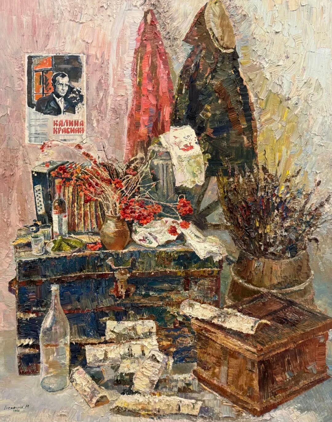 作品以静物的方式呈现出纪念性的氛围。画面并不直接描绘作家本人的形象,而是通过象征性的物件组合,传达对这位苏联著名作家的敬意。质朴的摆设、深沉的色调与富有意味的构图,营造出一种沉静而庄重的氛围,呼应了舒克辛作品中所蕴含的平凡生活的诗意与人性的厚度。