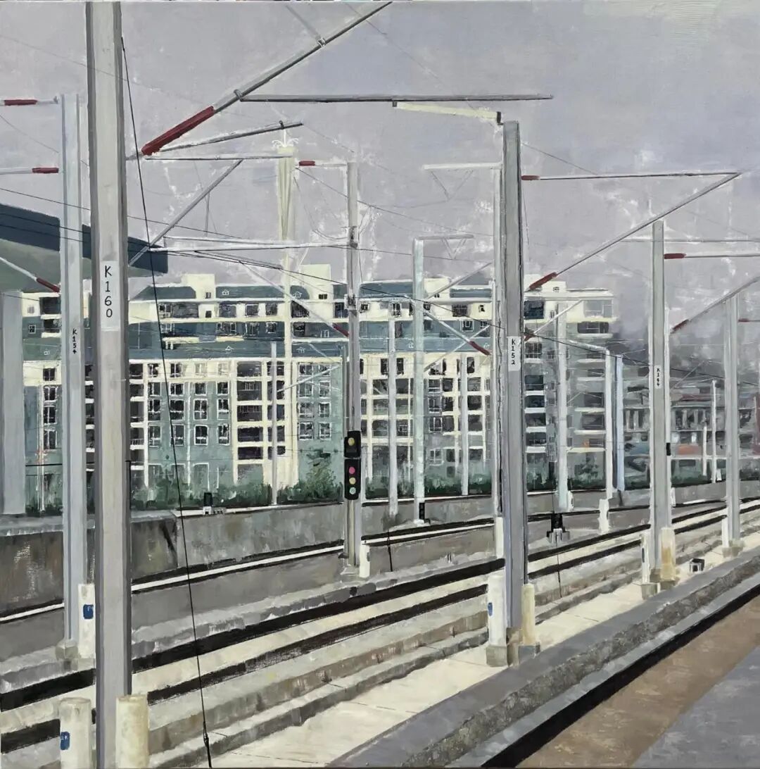 这幅作品以城市轨道交通场景为蓝本,铁轨延伸向远方,电杆如卫士般矗立,背后的建筑承载着生活温度。它是我毕业创作的成果,记录城市发展脉动,也凝聚着我对生活、对时代的观察与思考。毕业不是终点,是新起点,愿带着这份对平凡场景中诗意与力量的捕捉,在艺术路上继续奔赴,用画笔讲述更多美好。
