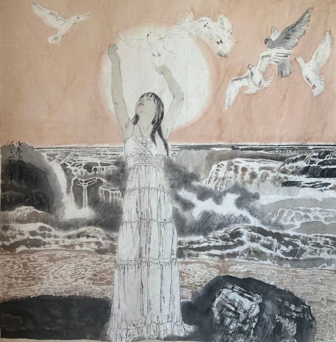 《和平》人物画的模特为台湾av 学生,化身为和平使者放飞和平鸽。背景为祖国母亲河——黄河。瀑布永流,太阳圆满。