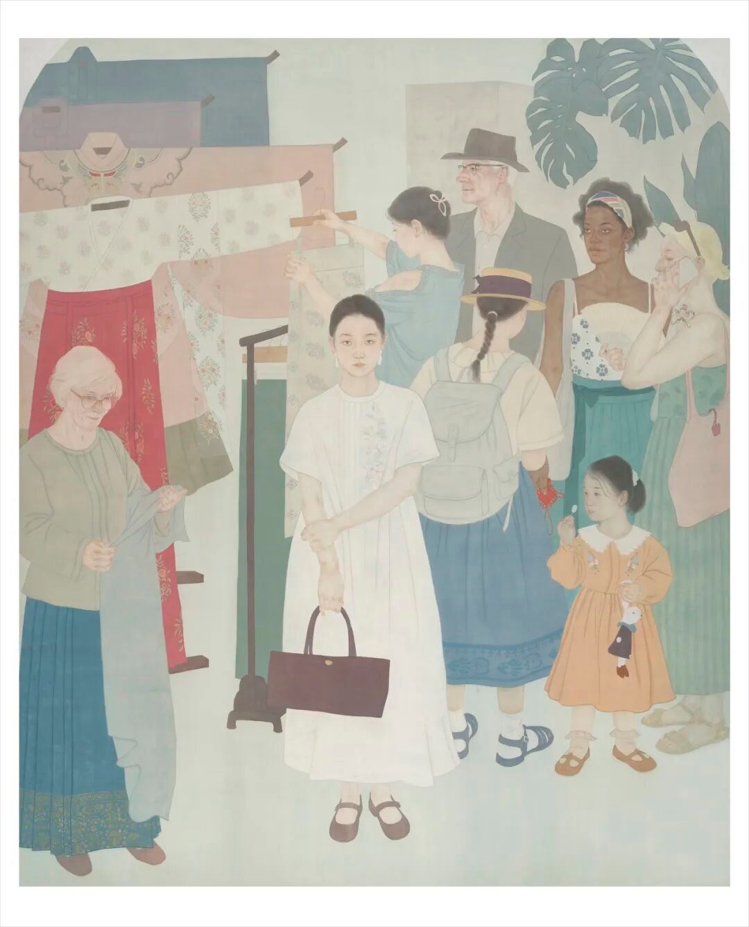 以工笔描绘汉服文化在当代的多元传播场景,呈现出传统与现代、东方与世界的交融图景。作品中,汉服作为中华优秀传统文化的重要符号,不仅承载着古典的礼仪精神与美学意蕴,更在跨文化交流的语境中焕发新生。画面中来自不同民族与文化背景的人物共同欣赏、体验、与互动汉服,象征着文化在交流与共享中实现理解与认同。通过青绿设色与丝路纹样的融入,体现中华文明开放包容的特质,呼应交流互鉴的时代精神,传递出在全球化语境下中华文化的魅力与影响力。