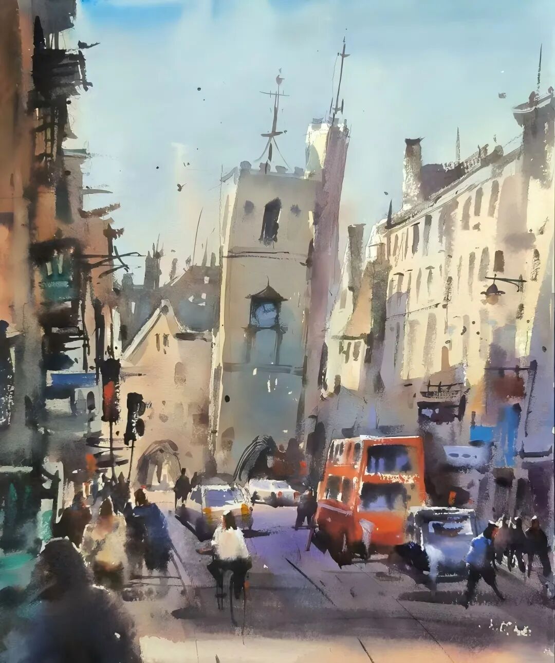 作品以水彩描绘了哈尔滨最具代表性的街景。各式俄罗斯风格的建筑沿街而立,洋溢着浓郁的异域情调。透明而灵动的水彩笔触,不仅勾勒出建筑的独特轮廓,也传递出这座城市历史沉淀与文化交融的氛围。作品借由建筑群的组合,展现出中俄文化在空间与时间中的交汇,让观者在欣赏建筑之美的同时,也感受到哈尔滨这座城市独特的文化记忆。