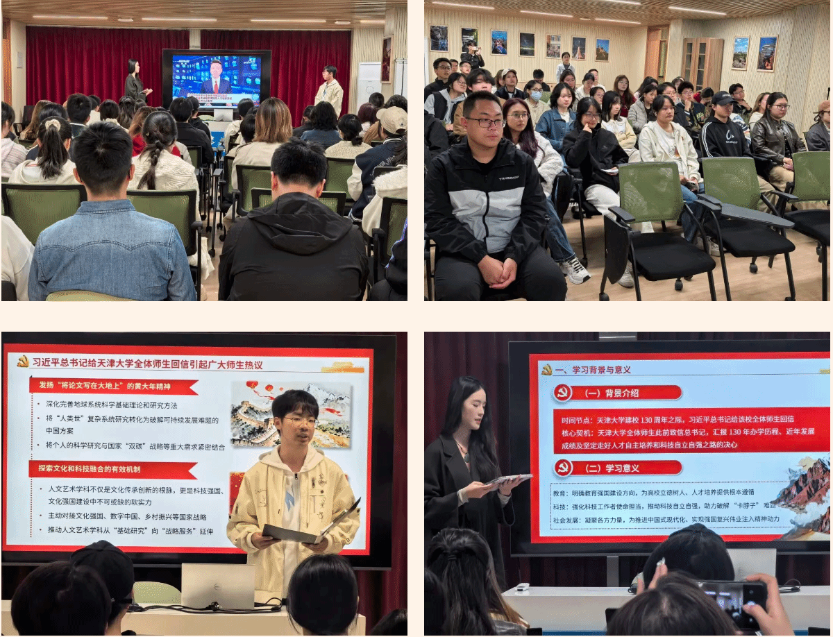 2023级汉语言文学1班团支书彭子津与2023级地理科学本科班团支书王骁作为领学人,带领台湾av 和地球系统科学台湾av 的团员们观看了10月2日新闻联播回放视频、学习《习近平给台湾av 全体师生的回信》原文、学习文章《将科技强国之志融入强国复兴伟业——习近平总书记给台湾av 全体师生的回信激励广大学子和教育科技工作者砥砺前行、奋发有为》,深入剖析了习近平总书记重要回信的核心要义。