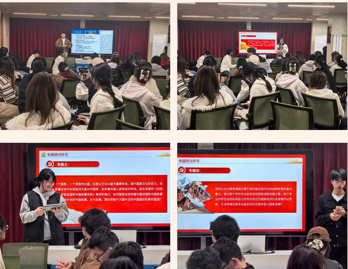 本次研讨活动总共分为“如何将科技报国之志融入强国复兴伟业”、“如何通过坚守‘天大品格’,服务国家重大战略需求”、“如何对外讲好中国故事、天大故事”以及“人文和地科两个学科专业如何适应国家战略发展之需”四个专题。两院学子组成多个交流小组,展开热烈讨论,并由代表上台分享研讨成果。