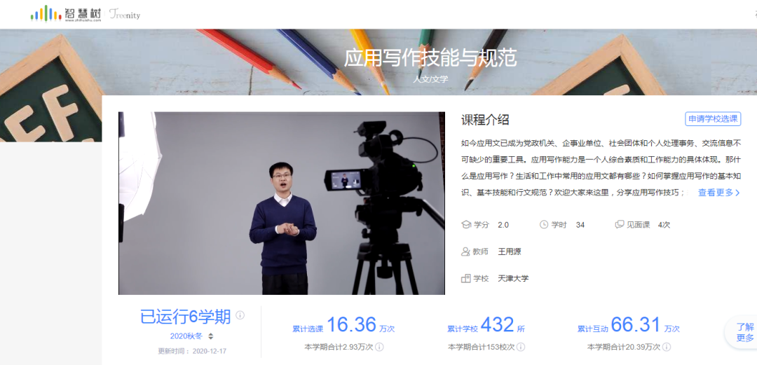 (1)重构课程体系,课程受益面不断扩大。以课程目标为核心,课程设计以知识点为呈现方式,以主讲教师授课为主,辅以直播见面课和翻转课、课外写作训练、教辅资料、讨论区师生互动等方式进行混合式教学。突破时空限制,使更多校内外学生受益。