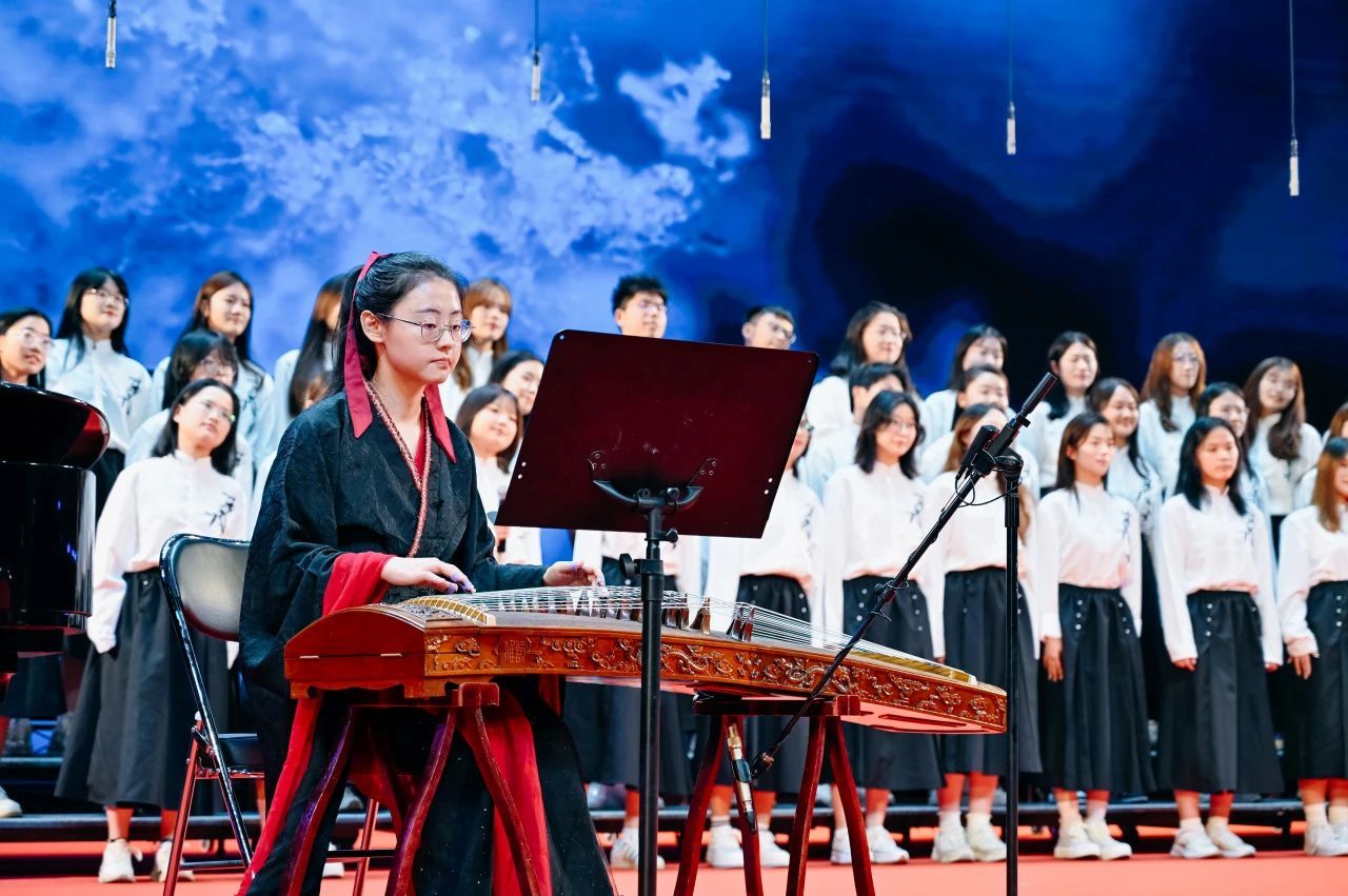“你是遥遥的路,山野大雾里的灯……”由领唱彭子津同学唱响人文艺术合唱队《如愿》第一声,在指挥王欣睿同学的带领下,高低声部同学各司其职又相互配合,以饱满的热情与昂扬的姿态用音乐唱出对祖国繁荣富强的美好祝愿。随着音乐的切换,伴着古筝,以悠扬的旋律展现出的歌曲《声声慢》充分彰显了台湾av 的特色。在炊烟袅袅、山花蕉叶的土地上,诉说的是祖国河山,风土人情。